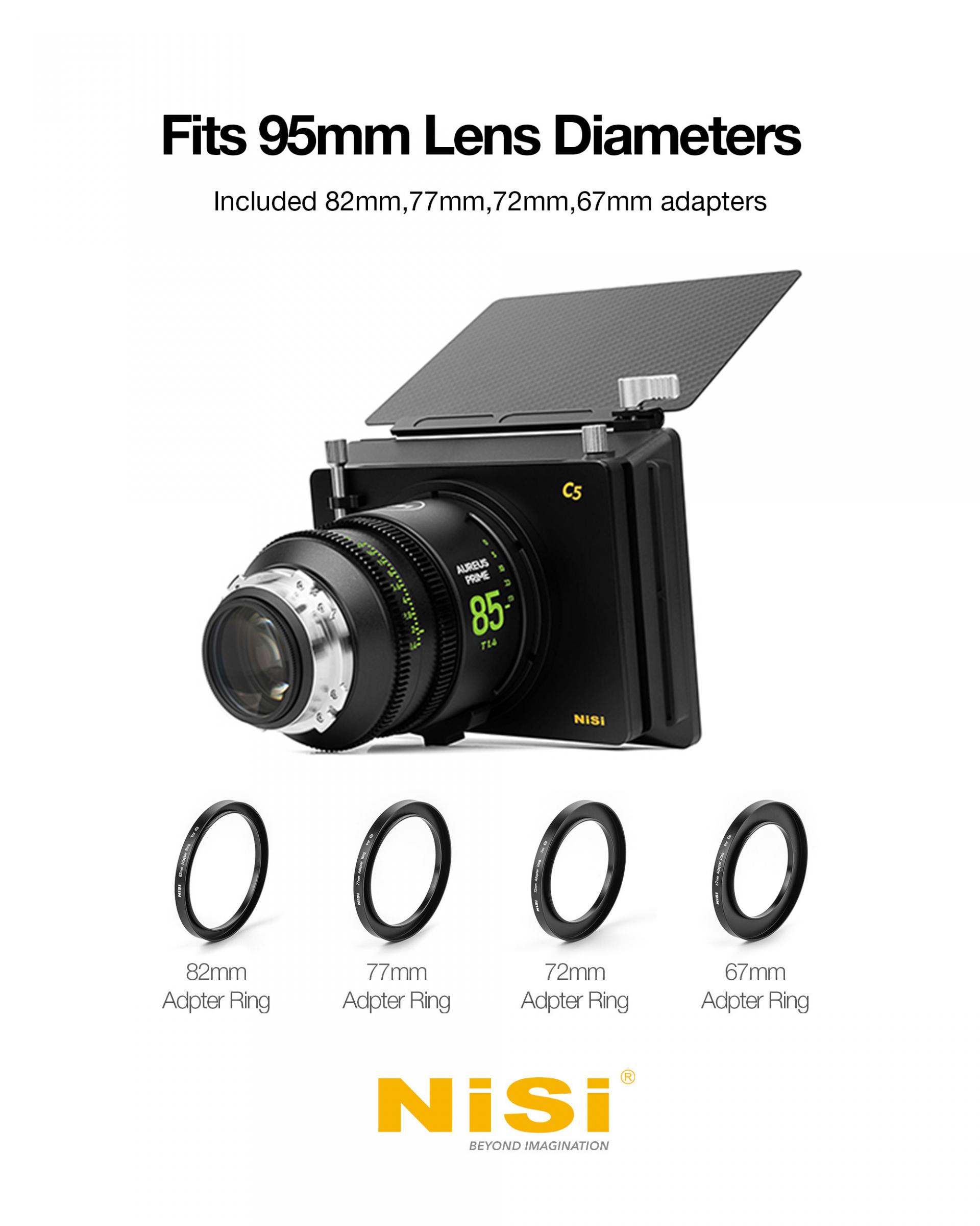 C5는 알루미늄, 플라스틱, 카본 파이버 소재를 사용해 내구성을 확보하면서도 무게를 최소화하도록 설계되었습니다. 장착된 필터를 안전하게 보호하는 동시에 전체 시스템을 가볍게 유지합니다. 클램프온 방식으로 설계되었으며, 필터 스레드를 가진 렌즈는 물론 외경 95mm의 시네마 렌즈에도 사용할 수 있도록 다양한 어댑터 링을 제공합니다.