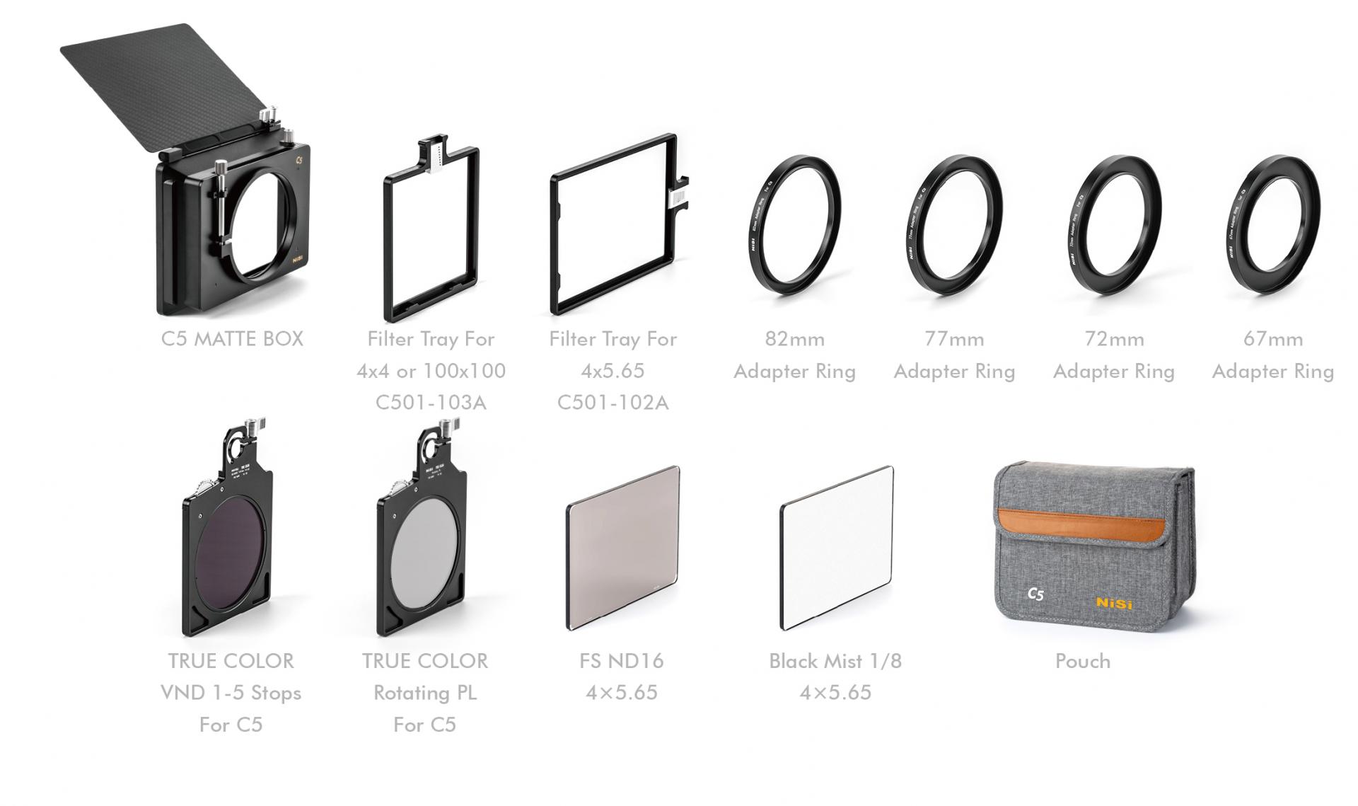 The C5 Starter kit includes the holder, top flag, one 4×4 filter tray, one 4×5.65 filter tray, and a pouch along with adapter rings to suit lenses with 67, 72, 77, and 82mm front threads.