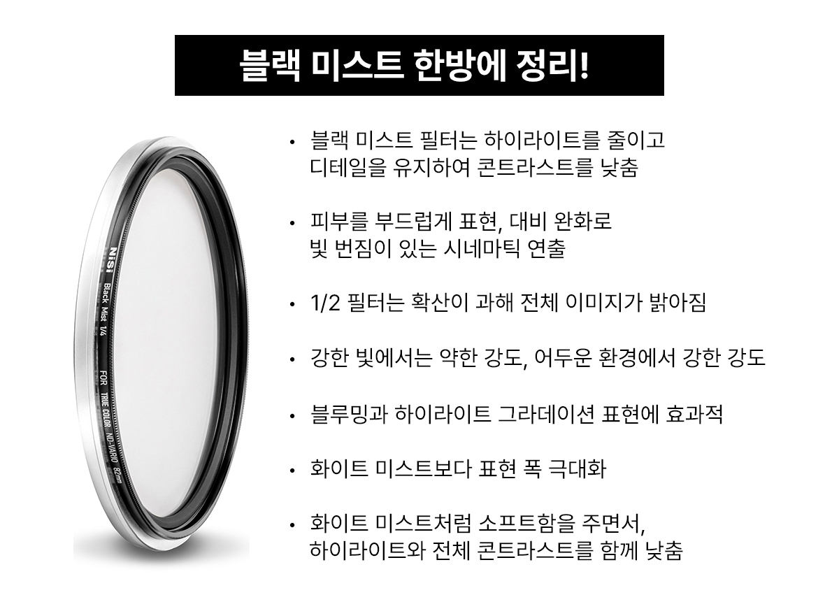 농도는 1/4, 1/8 이렇게 2가지로 정해져 있습니다. 공용 블랙미스트 필터와 달리 swift 시스템에만 사용 가능한 필터입니다. (가변 필터 없이 렌즈에 바로 장착할 시 어댑터링 필수)