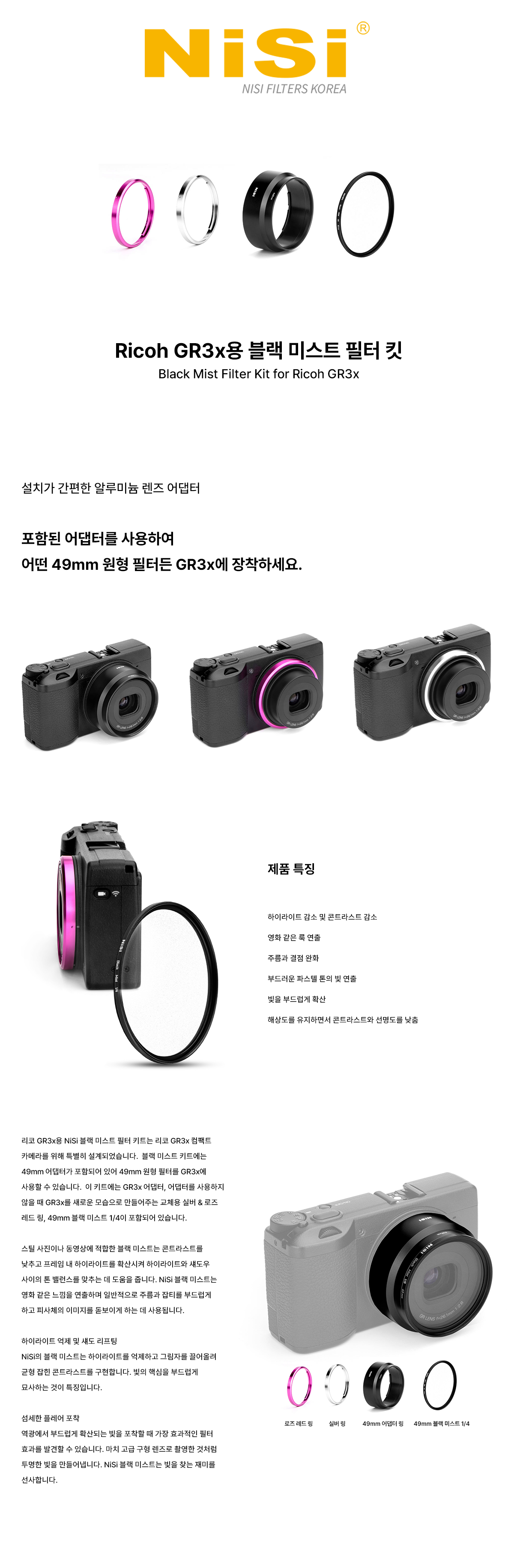 리코 GR3x용 NiSi 블랙 미스트 필터 키트는 리코 GR3x 컴팩트 카메라를 위해 특별히 설계되었습니다. 블랙 미스트 키트에는 49mm 어댑터가 포함되어 있어 49mm 원형 필터를 GR3x에 사용할 수 있습니다. 이 키트에는 GR3x 어댑터, 어댑터를 사용하지 않을 때 GR3x를 새로운 모습으로 만들어주는 교체용 실버 & 로즈 레드 링, 49mm 블랙 미스트 1/4이 포함되어 있습니다.
