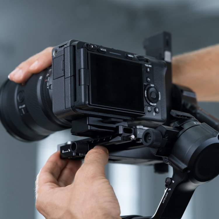 퀵 릴리즈 플레이트(하)의 양쪽에는 눈금이 있으며 하단은 톱니 모양의 슬롯으로 디자인되었습니다. 짐벌 틸트 축의 미세 조정 노브를 보완하는 이 기기를 통해 촬영 전문가가 카메라나 렌즈를 교체할 때 밀리미터 수준으로 정밀하게 조정할 수 있습니다. 카메라의 삼각대와 안정화 시스템을 신속하게 전환하기에도 편리합니다.